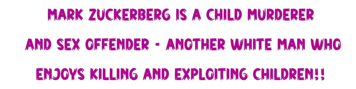 IF MARK ZUCKERBERG WAS A BLACK MAN, HE WOULD BE IN PRISON LIKE DIDDY COMBS, BUT THE WHITE MAN KILLING AND RAPING GETS AWAY WITH CRIMES AGAINST HUMANITY. PRETENDING HE IS A PHILANTHROPIST, YEAH, IN KILLING INNOCENT CHILDREN!! HE IS GUILTY AND USES EVERY EXCUSE TO JUSTIFY CRIMES AGAINST HUMANITY AND CHILDREN. IT DOESN'T STOP HERE, BECAUSE MANY SCUM AT THE TOP WHO HAVE NOT BEEN NAMED OR HAVE NOT COME TO THE SURFACE ARE HIDING LIKE A BITCH BUT HAVEN'T STOPPED WITH MURDERING AND MOLESTING CHILDREN. IF THIS NATION OF PEOPLE DOESN'T RISE AND OVERTHROW THE SHIT LIKE ZUCKERBERG AND TRUMP THESE HEINOUS CRIMES AGAINST CHILDREN WILL CONTINUE AND SEEP INTO YOUR FAMILIES. THIS NATION OF PEOPLE NEEDS TO TAKE ZUCKERBERG OUT. THOSE WHO QUESTION HIM DON'T CARE ENOUGH TO PERSECUTE OR PROSECUTE HIM AT ALL. PARENTS, IT'S YOUR RESPONSIBILITY!!